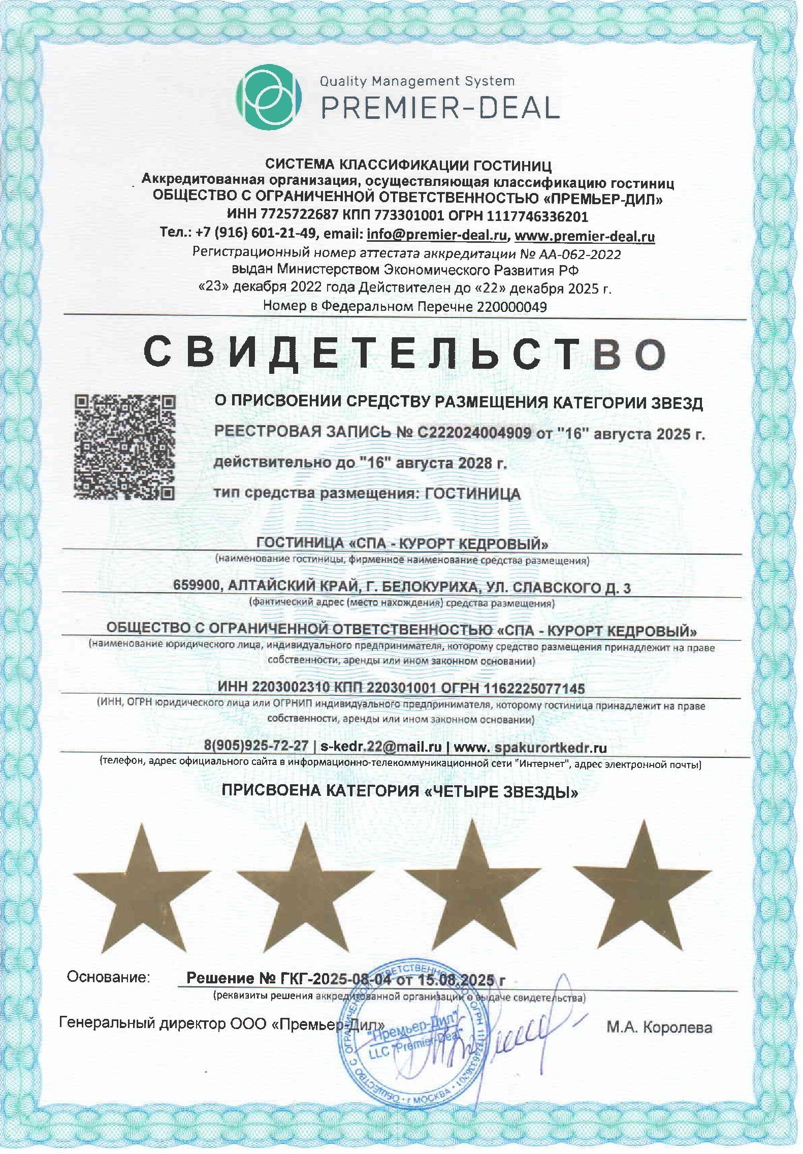 С гордостью сообщаем об успешном подтверждении статуса нашего отеля в категории «четыре звезды»! Процедура классификации завершена, и соответствующая запись официально зарегистрирована в Едином федеральном реестре средств размещения по ссылке С222024004909